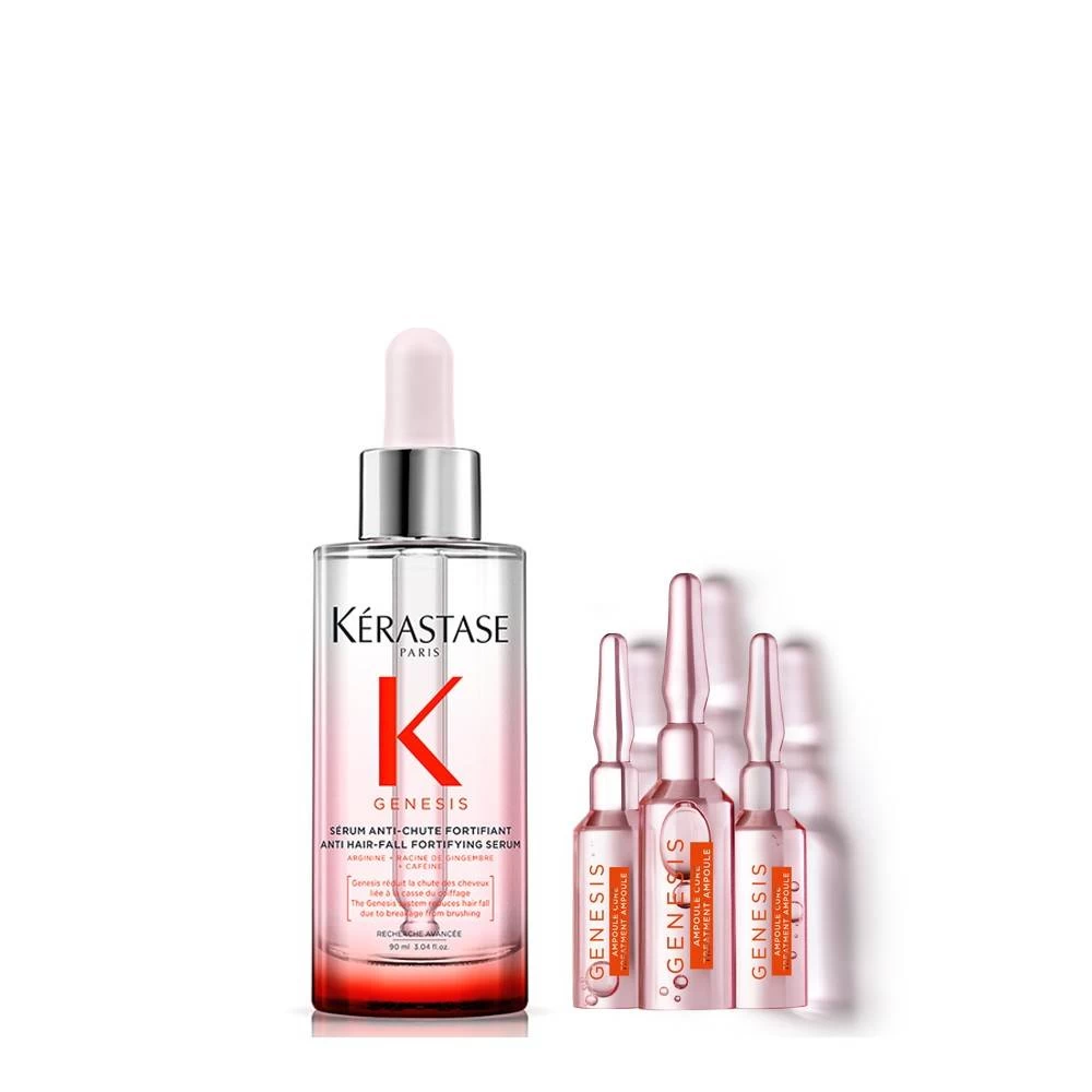 Duo Fortifiant Anti-Chute Genesis Kérastase : un Sérum Fortifiant Anti-Chute 90 ml quotidien et une cure d’attaque de 10 Ampoules Fortifiantes Anti-Chute 10x6ml.