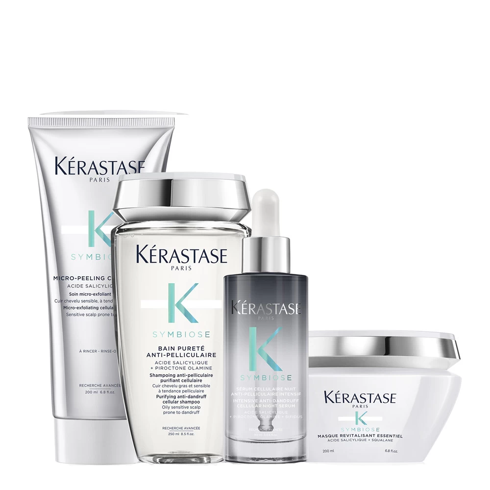 Pack 4 Produits Cuir Chevelu Gras Symbiose Kérastase : un Micro-Peeling, un Bain Pureté, un Masque Revitalisant et un Sérum Cellulaire Nuit.