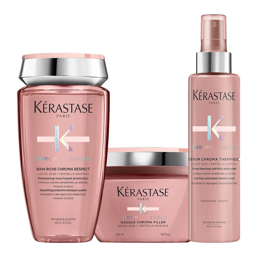 Pack Riche Chroma Respect Chroma Absolu Kérastase composé d’un Bain Riche Chroma Respect 250ml, d’un Masque Chroma Filler 200ml et d’un Sérum Chroma Thermique 150ml, pour les cheveux colorés sensibilisés ou abîmés, normaux à épais.